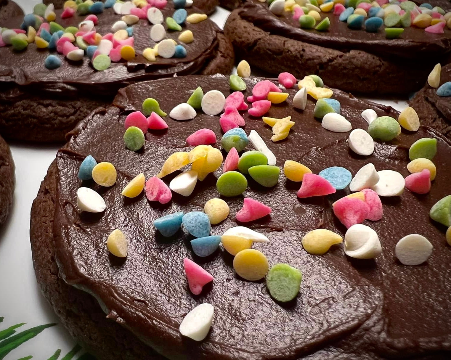 Soft brownie cookie with creamy chocolate ganache and mini chocolate sprinkles.