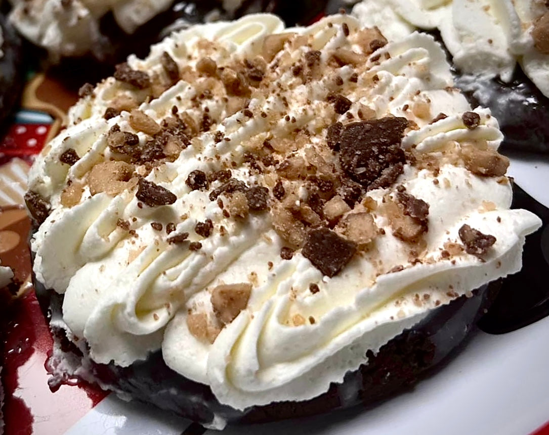 Soft chocolate cookie with heath crumble and a light whipped topping.