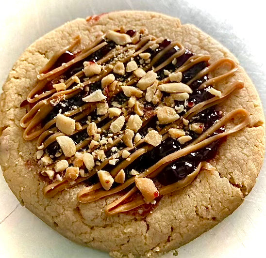 Soft and chewy cookie topped with crunchy peanuts, strawberry preserves, and peanut butter drizzle.