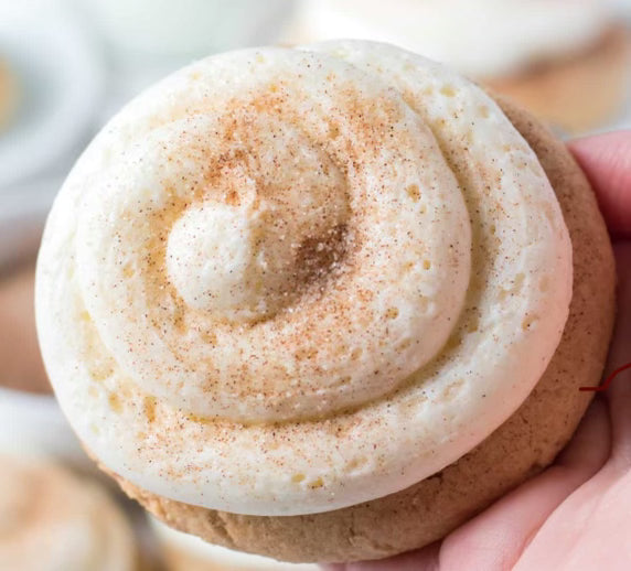 Snickerdoodle cookie sprinkled with cinnamon sugar and topped with cream cheese frosting.